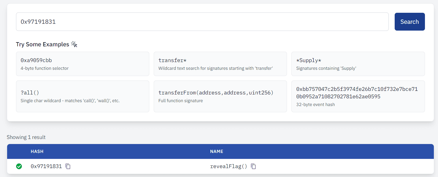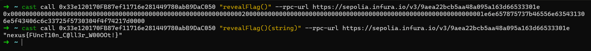 Example withcast:cast call 0x33e120170FB87ef11716e281449780abB9DaC050 "revealFlag()" --rpc-url https://sepolia.infura.io/v3/9aea22bcb5aa48a095a163d66533301eObserve the call result — one of the functions will return the flag directly on-chain.