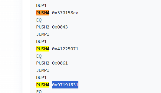 PUSH4selectors you find.Decode selectors to possible function names using signature lookup sites: